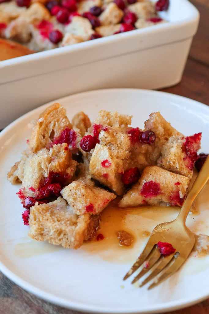 - Soak: Let the mixture sit at room temperature for 20 minutes. About halfway through, gently press the bread down again to ensure all pieces have contact with the custard. After soaking, sprinkle ¾ cup cranberries evenly over the top.