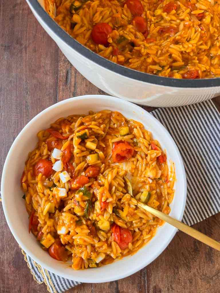 Last summer, we took a family trip to Greece and spent part of our time on the island of Naxos. Naxos is incredibly beautiful and has such a rich foodie culture. The food there was unforgettable—fresh, local, and full of authentic Greek flavors. One dish that really stuck with me was a tomato orzo I had during our stay. It was so simple yet so good that I knew I’d eventually recreate it for my blog. My Naxian-inspired version of Greek Tomato Orzo is made with classic Greek ingredients like tomatoes, lemon, dill, and plant-based feta. The zucchini and dill are my little twists on the version I had in Greece. It’s flavorful, completely delicious and the perfect one-pot meal.