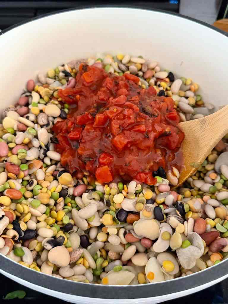 I first learned about the 15-bean mix last year from my mother-in-law. Beans are honestly one of my favorite foods, and when we were visiting her in Florida, she made this mixed bean soup that caught my attention. I couldn’t figure out how she managed to get so many types in one pot until I realized you can actually buy a bag of mixed beans—such a game changer. Some brands come with a “ham” seasoning packet, which you can just toss, of course. Once I got home, I started working on my own version, and that’s how Hearty Vegan 15-Bean Soup with Tomatoes came to life. It’s hearty, well-seasoned, full of fiber and protein, freezes beautifully, and makes enough to feed you for days.