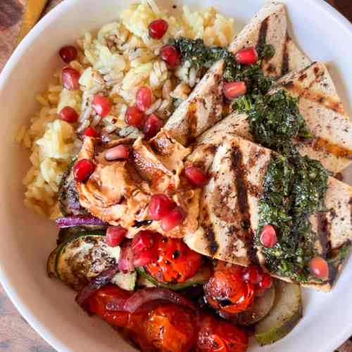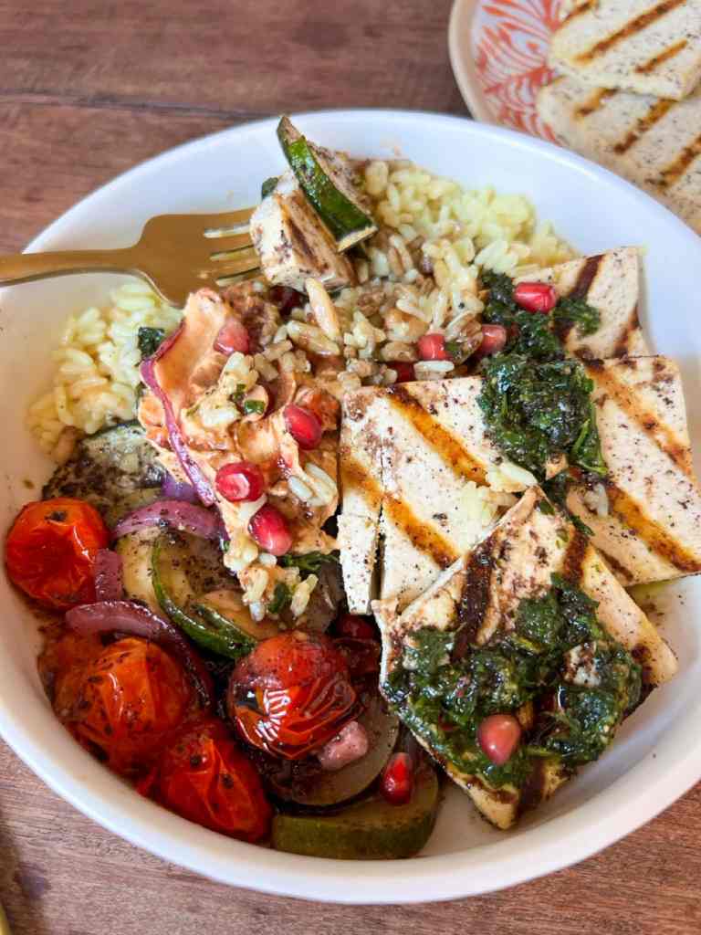 A fresh and vibrant plant-based bowl featuring grilled tofu, sumac-roasted veggies, and an herby North-Africa chermoula over pilaf.
