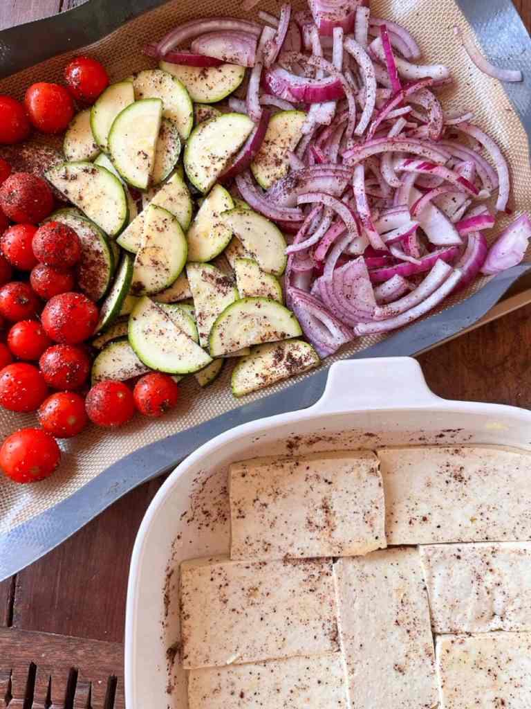 - Roast the veggies: Toss 1 ¼ cup cherry tomatoes, ½ large purple onion slices, and ½ large zucchini slices with 1 tbsp olive oil, 2 tsp sumac, salt, and pepper. Spread on a lined baking sheet and roast for 18–22 minutes, flipping halfway, until tender and lightly caramelized.