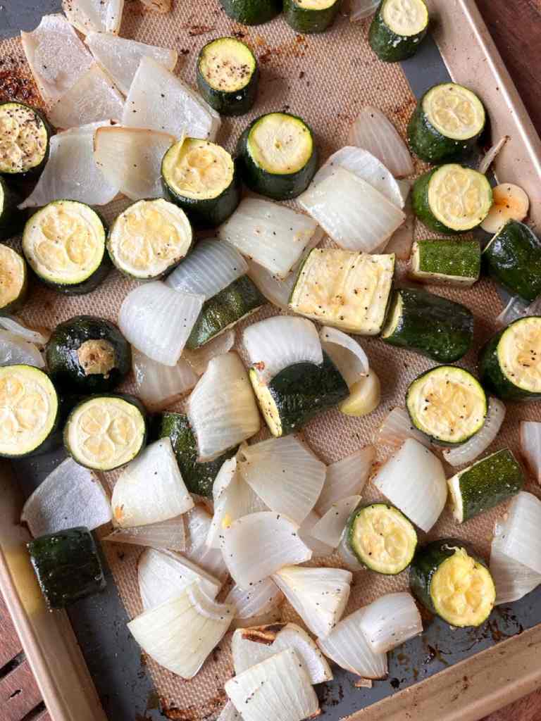- Prepare the Vegetables: Place the zucchini, onion, and garlic on a baking sheet. Drizzle 2 tbsp olive oil over the vegetables and season with ¼ tsp salt and ¼ tsp black pepper. Toss to coat evenly.