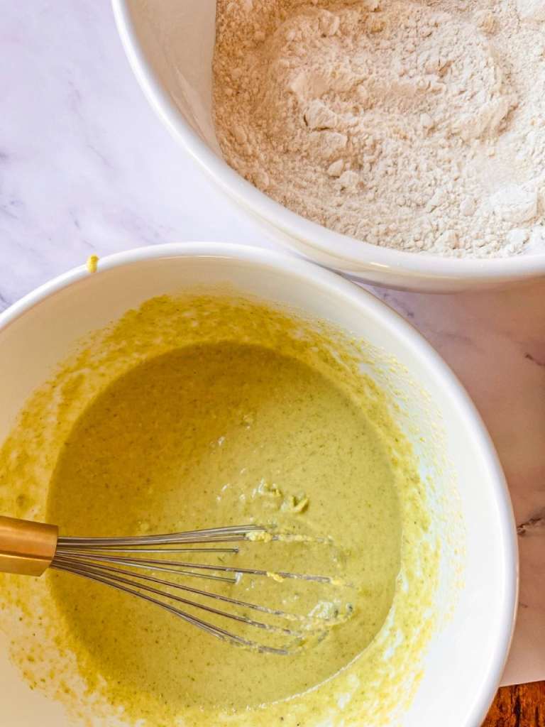 - Combine the Wet Ingredients: In a separate large bowl, whisk together ½ cup pistachio paste, 1 cup oat milk, ¼ cup melted butter or oil, 1 tsp apple cider vinegar, and 1 tsp vanilla extract until smooth.