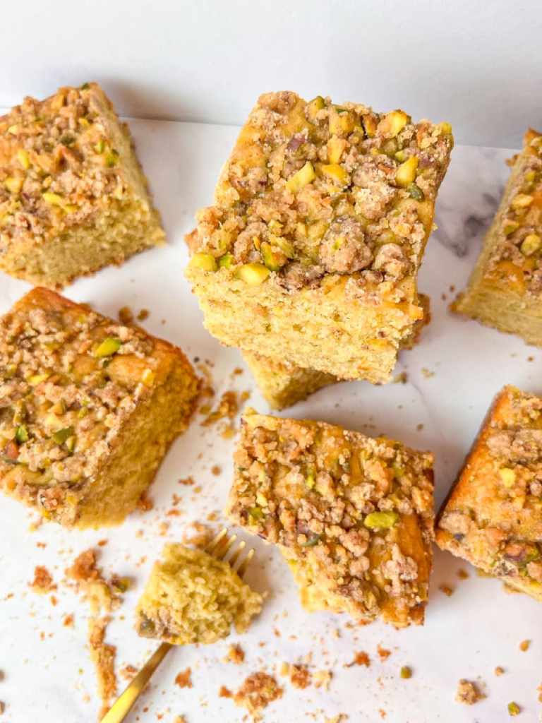 A soft, nutty cake packed with pistachio flavor and finished with a buttery crumble—perfect for breakfast or dessert.