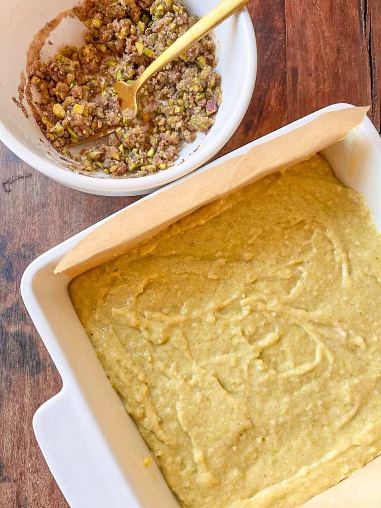 - Make the Crumble Topping: In a small bowl, combine ¼ cup all-purpose flour, ¼ cup brown sugar, 4 tbsp melted butter, ½ tsp ground cinnamon, and ⅓ cup chopped pistachios. Mix until crumbly and set aside.