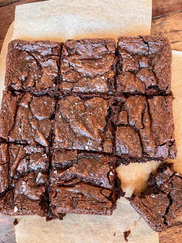 Crispy crust, chewy center. The edges bake up crisp while the inside stays rich and moist—a perfect brownie texture contrast.