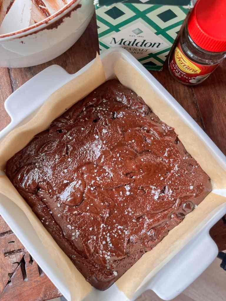 - Prepare to bake: Spread the batter evenly into the prepared pan. Sprinkle the top generously with flaky sea salt—this helps it stick before baking (you can always add more after).