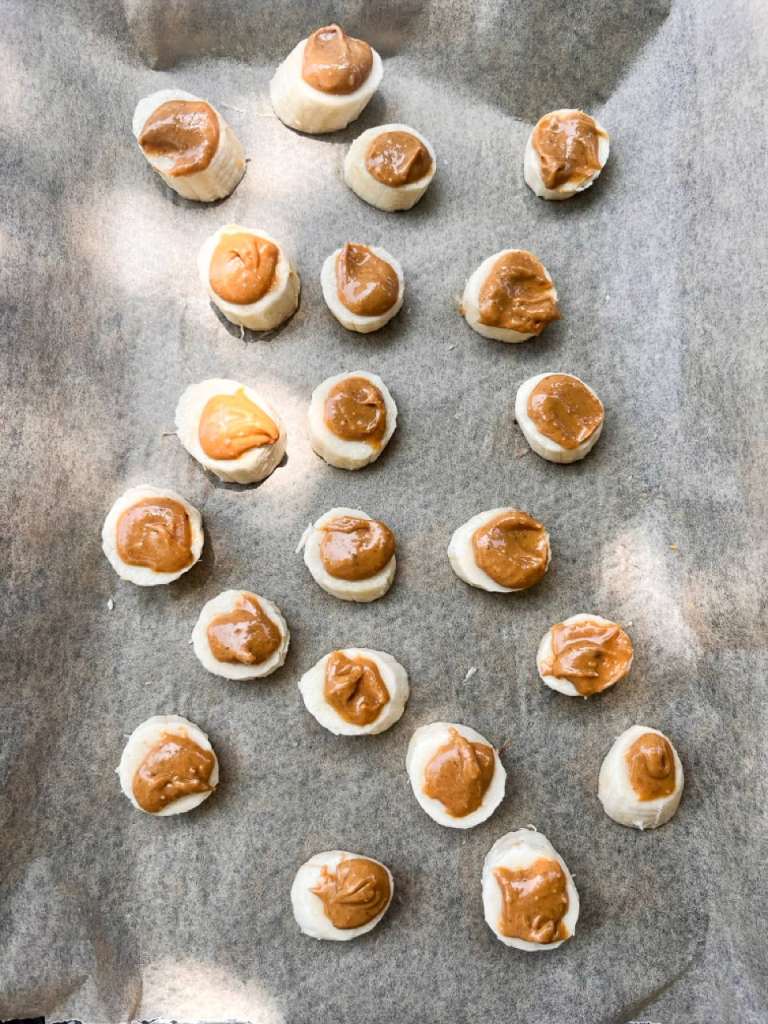 - Add Peanut Butter: Spoon a heaping ¼ teaspoon of peanut butter onto each banana slice and gently flatten it into an even layer. Add as much or as little as you like! Once all are topped, place the tray in the freezer for at least 4 hours, or overnight, until fully frozen.
