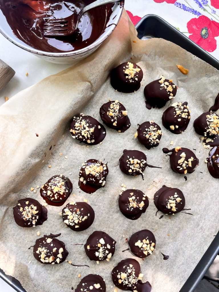 - Top with Peanuts and Freeze Again: While the chocolate is still wet, sprinkle each piece with a pinch of finely chopped peanuts. Return the tray to the freezer and let set for at least 2 more hours, or until the chocolate is firm.